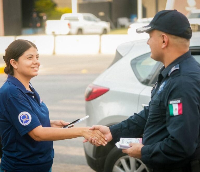 Con la mano extendida y una sonrisa, elementos de Seguridad Pública y Vialidad de Santa Catarina...