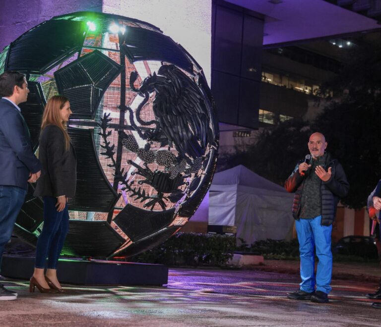 • La obra consiste en un balón de futbol de tres metros de diámetro, con iluminación...