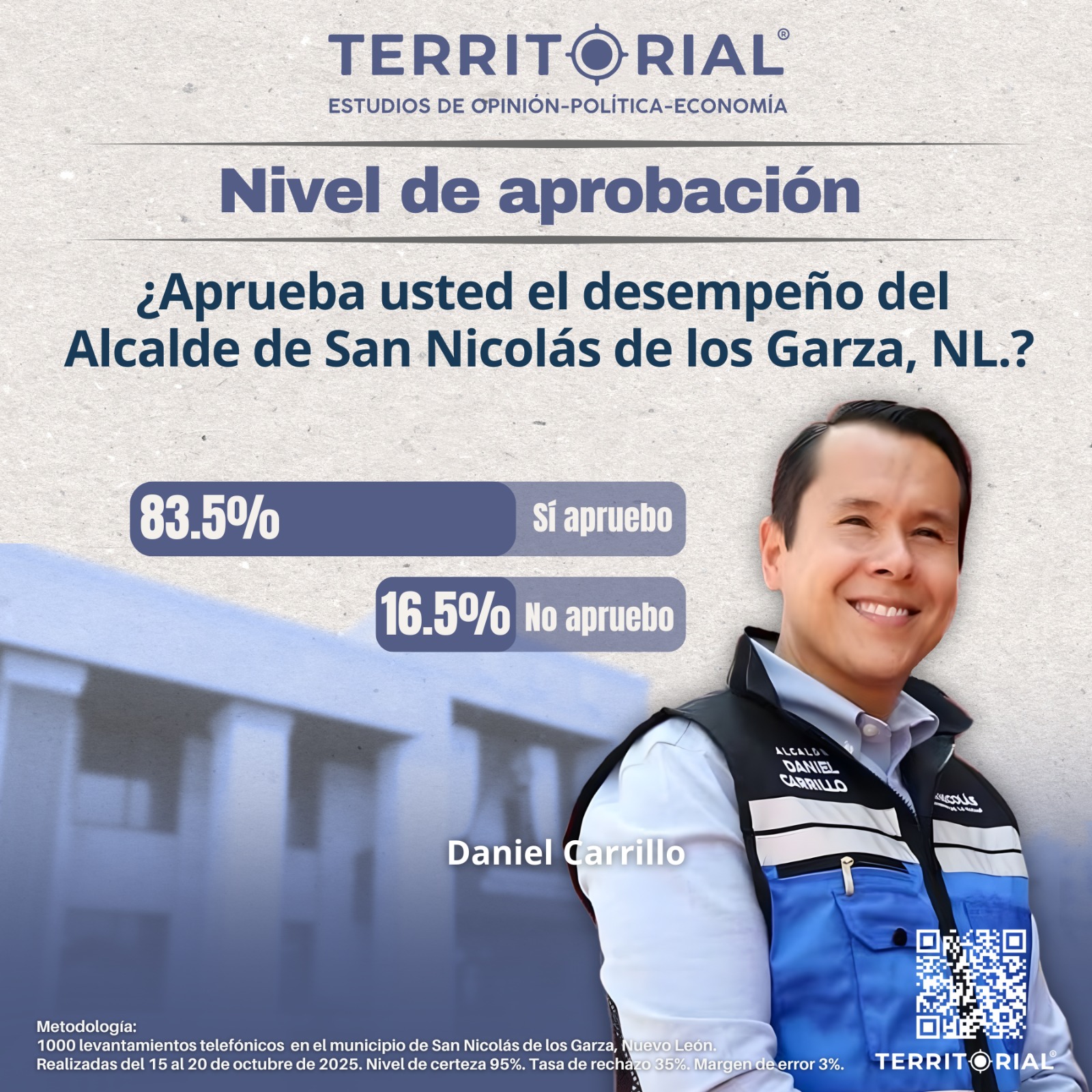 El levantamiento de datos se realizó del 15 al 20 de octubre de 2025, mediante 1,000 entrevistas telefónicas a residentes de San Nicolás de los Garza, con un nivel de confianza del 95% y un margen de error de ±3%. El estudio refleja que solo el 16.5% de los encuestados dijo no aprobar la gestión municipal.