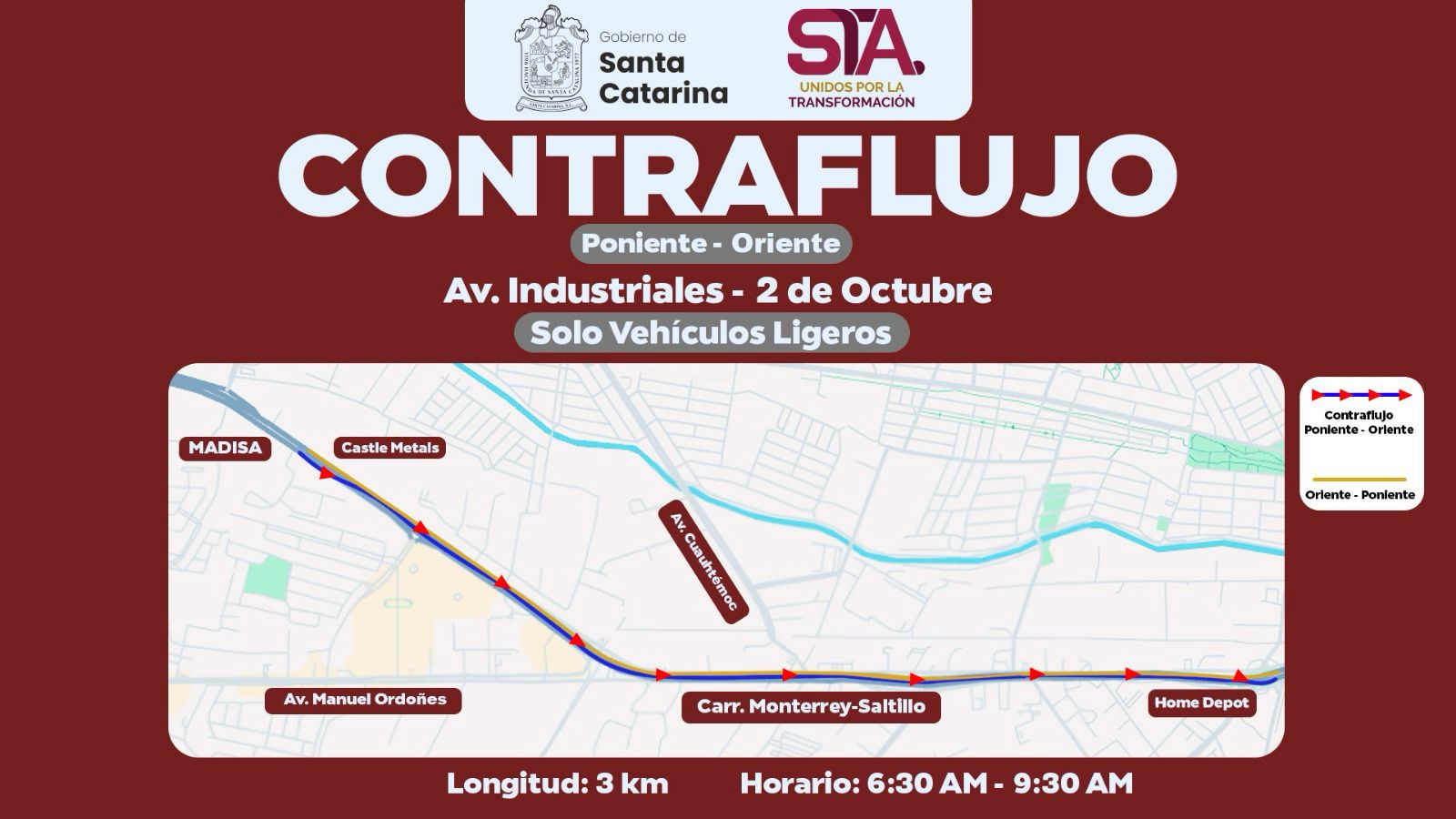 Con el objetivo de mejorar la movilidad en una de las zonas con mayor carga vehicular, el Gobierno de Santa Catarina implementará un carril de contraflujo de poniente a oriente para vehículos ligeros en el corredor de la Avenida Industriales hacia la Avenida 2 de Octubre.