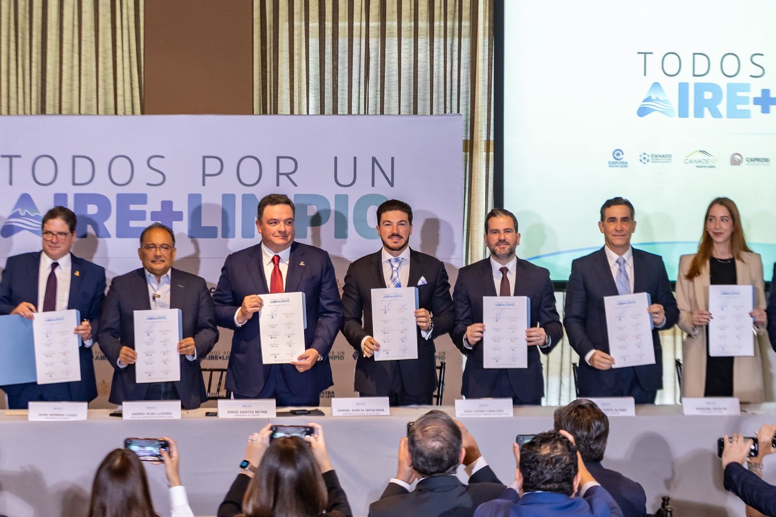 San Pedro Garza García, Nuevo León.- Con el objetivo de trabajar por la sostenibilidad ambiental en el estado, el Gobernador Samuel Alejandro García Sepúlveda y las cámaras empresariales firmaron la iniciativa “Todos por un Aire + Limpio”.