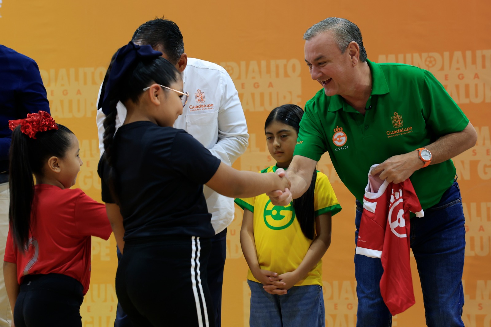 En forma simbólica se entregaron jersey a los alumnos del Jardín de Niños “José Eleuterio González”, quienes representarán a la Selección de México; a estudiantes de la Primaria “Felipe de Jesús Ocampo”, portando la camiseta de Túnez, entre otros.