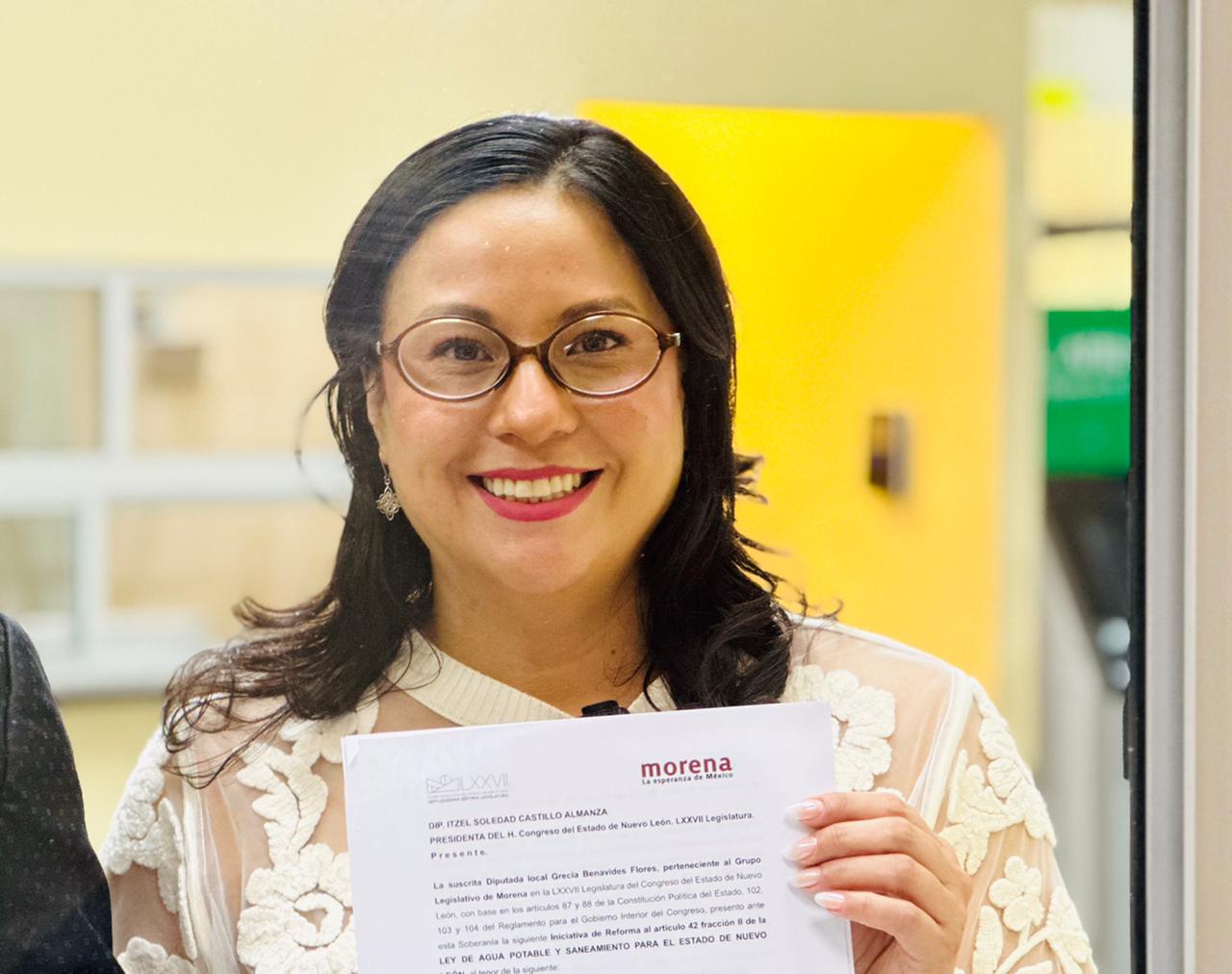 La diputada local Grecia Benavides Flores, del Grupo Legislativo de Morena, presentó una iniciativa de reforma a la Ley de Agua Potable y Saneamiento de Nuevo León para que los hogares que acrediten un consumo responsable paguen una tarifa preferencial, por debajo de los parámetros que defina Agua y Drenaje de Monterrey.