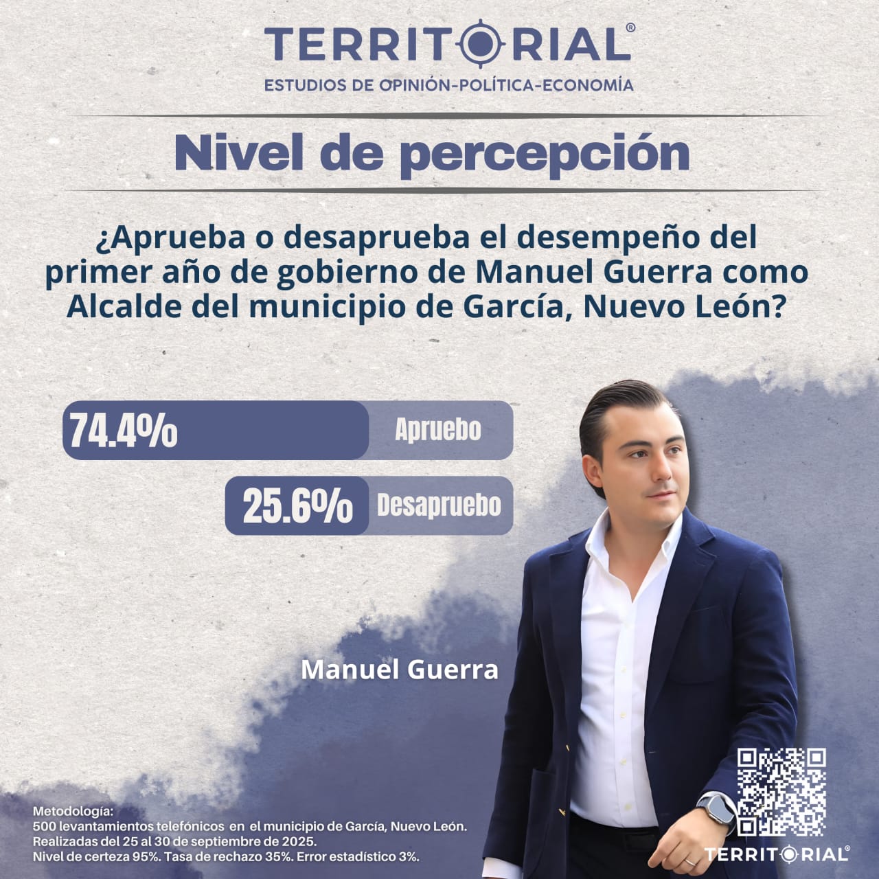 Ante el cuestionamiento «¿Aprueba el desempeño del primer año de gobierno de Manuel Guerra como Alcalde del municipio de García, Nuevo León», el levantamiento indica que el 74.4% sí muestra simpatía con Guerra Cavazos.