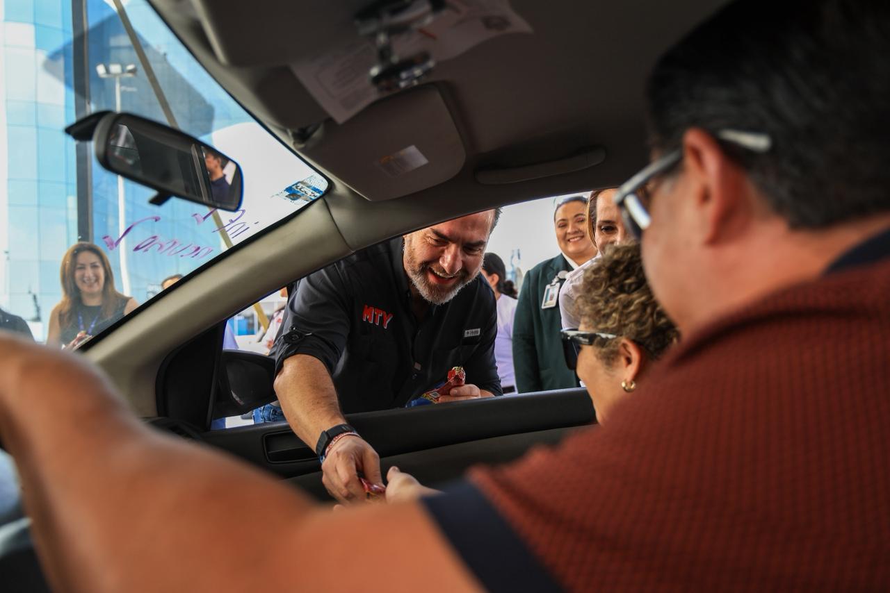 El edil, acompañado por su esposa la presidenta del DIF, Gaby Oyervides, e integrantes del gabinete recorrieron los módulos Drive Thru instalados en el estacionamiento de la Arena Monterrey, así como los que brindaron servicio a los peatones.